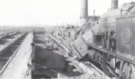 The main line, two and a half miles long, was laid directly on to the surface of the ground, and the section entering the works was on a gentle grade. Here the 0‑6‑0 saddle tank slowed or waited with its train uncoupled. Meanwhile the works shunter had entered a short siding on the edge of the works. The loaded train drifted down past this siding and then its locomotive accelerated rapidly away to run on to the furthest tipping dock road. As soon as the last wagon had cleared the short siding points, the works shunter rushed out, chased the train and pushed it to the nearer tipping dock. Such a burst of activity simply to save running round was remarkable. The first train was then usually shunted on to the middle road, ready for the second train, and the wagons tipped. Normally the large locomotives were not allowed on the gantry, but occasionally one had to act as yard shunter when both the small locomotives were under repair.