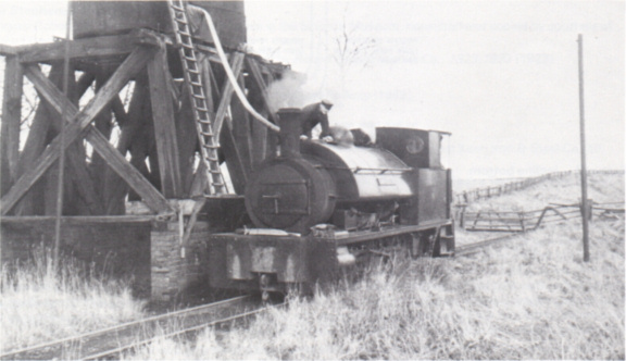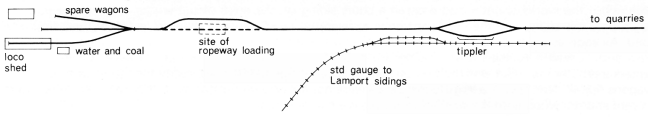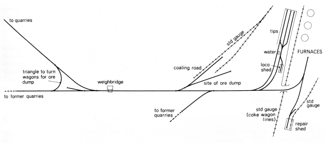 The layout at the works was basically a long curved loop round the water tank, terminating in the tipping dock: the small locomotive shed led off the loop. A long siding ran down to the standard gauge for coaling, and another led to the standard gauge shed. About three hundred yards from the works there was a triangle and several sidings which had served as a wartime ore stockpile. The triangle was used to turn the single side tipping wagons so as to be able to tip the other way.