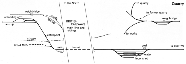 The quarries were above Pitsford reservoir, and latterly were about one and a half miles from the tipping dock. There was a loop near Holcot road bridge, beyond which the single track line continued towards the western edge of Scaldwell village. A loop also served the 1954 standard gauge tip, whilst yet another served the ropeway tip at the terminus. Just beyond there was a three-in-one point; one track led to the green painted corrugated iron shed with its water tank and coal stage outside, one was for spare wagons, and the third was formerly used as a shunting neck.