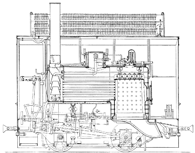 'This engine, designed and constructed by Merryweather & Sons, Greenwich, is constructed for a gauge of 4 feet 8½ inches, and is fitted with two 7½‑inch diameter by 12‑inch stroke cylinders inside the longitudinal frame-plates. It has two pairs of 28‑inch wheels, coupled, on a base 5 feet long. The cylinders are inclined to clear the coupled axle, and they are fitted with the ordinary shifting link-motion, with reversing gear at each end of the engine. The boiler is of the locomotive type, of mild steel, with a copper fire-box 2 feet 3½ inches square, and 85 brass tubes 1¾ inches in diameter outside, 4 feet long. The heating surface is 181 square feet. The working pressure is 150 lbs per square inch. The ash‑pan is specially designed to prevent the dropping of cinders or the showing of fire. It can be easily cleaned out when required. The ash‑pan damper can be worked from either end of the engine. The wheels are of steel, fitted with rolled steel tyres secured by screws. The exhaust steam is condensed in an air‑condenser, consisting of 404 thin 1‑inch copper tubes, laid in three double tiers 5 feet 10 inches long, making 617 square feet of condensing surface, transversely over the roof. These are fastened by ferules at each end to longitudinal copper passages or ducts, into which the exhaust steam is discharged, and from which the steam is free to pass into the transverse tubes. The ducts are divided by internal partitions into sections in order to direct the flow of steam alternately from one side to the other.