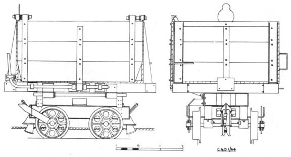 The original type of wagon was probably produced in the 1930's, nos. 15-18 still being in use. They are much smaller as they were tipped by hand before the tipping arrangements were altered in about 1956, the bodies being pivoted at a different point, These wagons are being replaced by the newer type at the time of writing (October 1964), but this may be delayed due to increased output. The cableway is due to be abandoned in September 1965 and it is hoped that either wagon 16 or 17 will go to Brockham Museum.